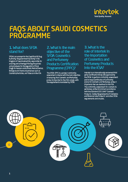 Intertek has been approved by the SFDA for processing and issuing the Certificate of Conformity for Consignments of Cosmetics, Perfumes and Personal Care Products exported to the Kingdom of Saudi Arabia (KSA) on the FASEH platform.